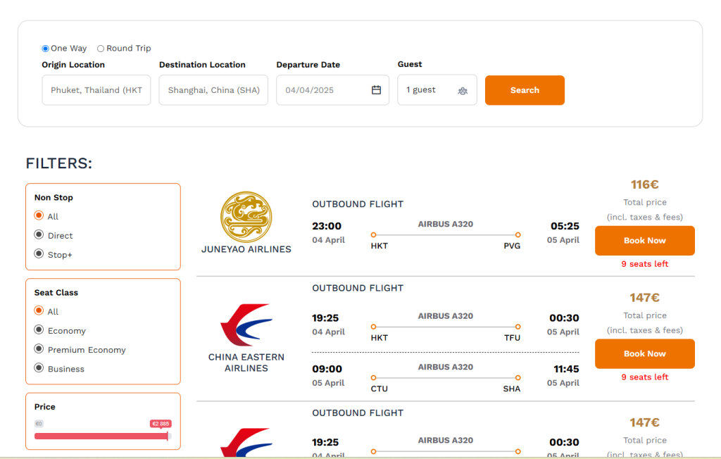 The plugin offers a powerful flight search tool, enabling customers to search for flights based on various criteria such as departure and arrival locations, departure and return dates, cabin class, and the number of passengers. The user-friendly interface ensures a quick and convenient search process.
